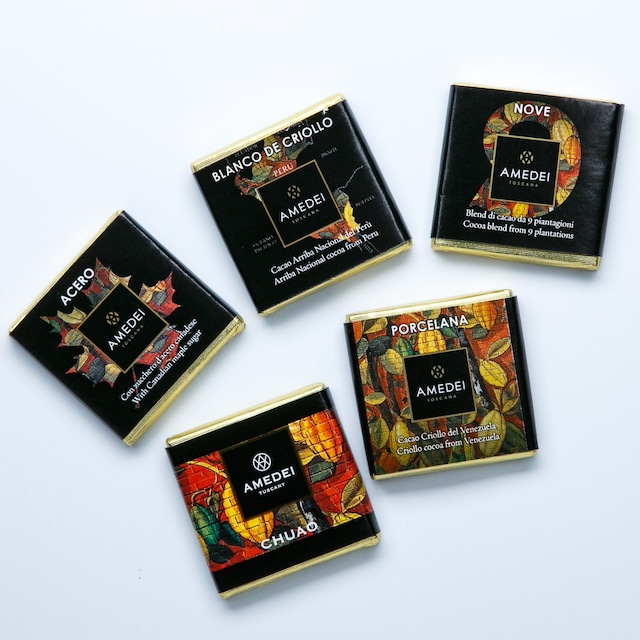 プレミアムカカオを使ったネーリシリーズを1種ずつ。気軽でさりげない贈り物に最適です。 ●原材料名:(ポルチェラーナ、ブランコデクリオロ、チュアオ、ノーヴェ)カカオペースト、キビ糖、ココアバター (アーチェロ)カカオペースト、ココアバター、メープルシュガー ●内容量:5枚 ●賞味期限:2027.5.15 ●保存方法:直射日光・高温多湿を避けて保存下さい。 ●原産国名:イタリア ※この製品の製造工場ではヘーゼルナッツ、アーモンド、ピスタチオ、くるみ、乳成分を含んだ商品を製造しています。 栄養成分(100gあたり) ポルチェラーナ::熱量569kcal, たんぱく質8.0g, 脂質41.0g, 炭水化物42.0g, 食塩相当量0.02g. ブランコデクリオロ::熱量586kcal, たんぱく質8.9g, 脂質42.0g, 炭水化物43.0g, 食塩相当量0.01g. チュアオ:熱量614kcal, たんぱく質7.7g, 脂質43.0g, 炭水化物49.0g, 食塩相当量0.00g. ノーヴェ:熱量583kcal, たんぱく質7.8g, 脂質44.0g, 炭水化物39.0g, 食塩相当量0.00g. アーチェロ:熱量626kcal, たんぱく質10.0g, 脂質58.0g, 炭水化物16.0g, 食塩相当量0.00g