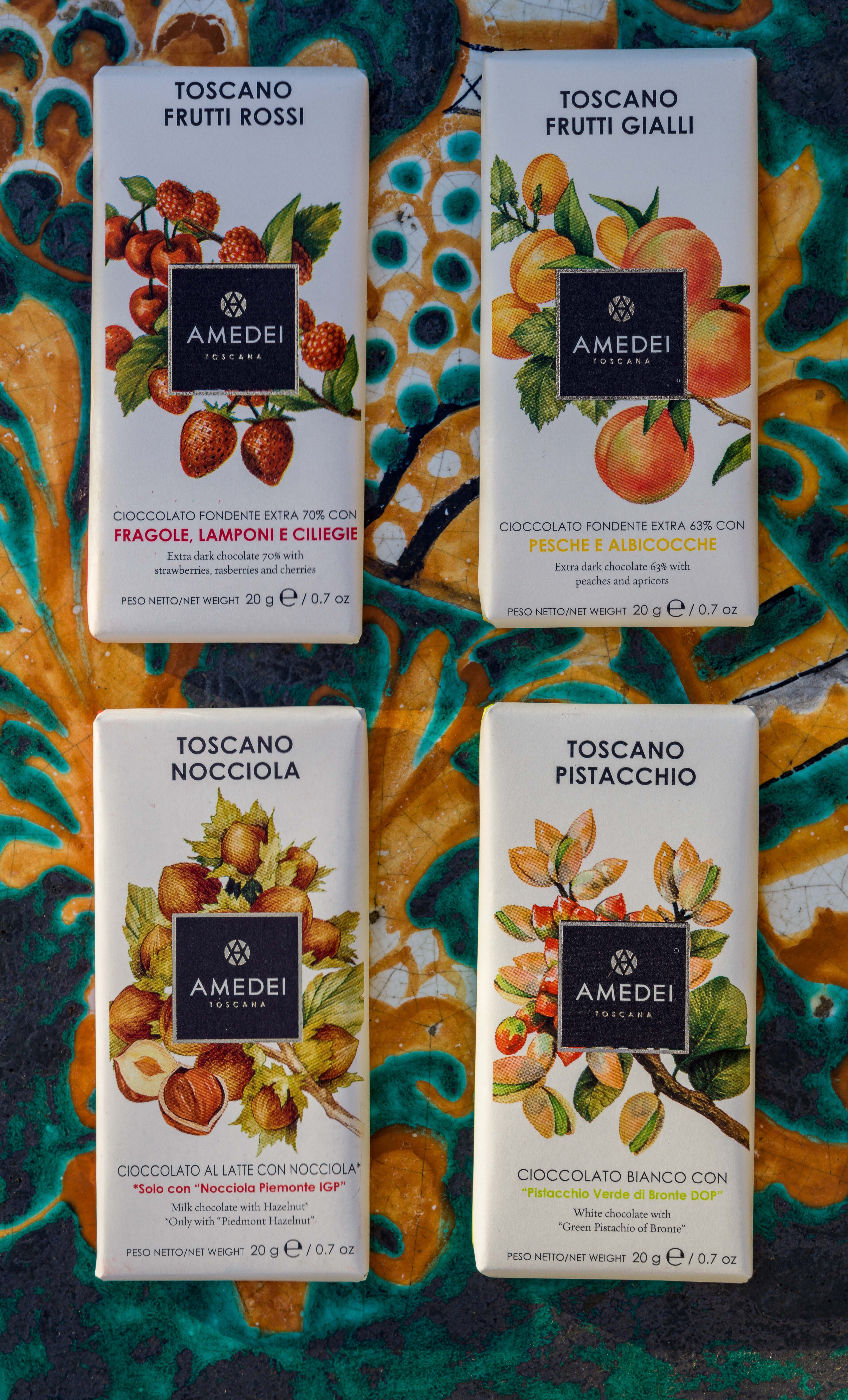 ・原材料名:【ヘーゼルナッツ】カカオペースト、キビ糖、ココアバター、全粉乳、ヘーゼルナッツ【ピスタチオ】キビ糖、ココアバター、全粉乳、ピスタチオ【トスカーノレッド】:カカオペースト、キビ糖、ココアバター、ストロベリー、チェリー、フランボワーズ【トスカーノブロンド】カカオペースト、キビ糖、ココアバター、黄桃、アプリコット