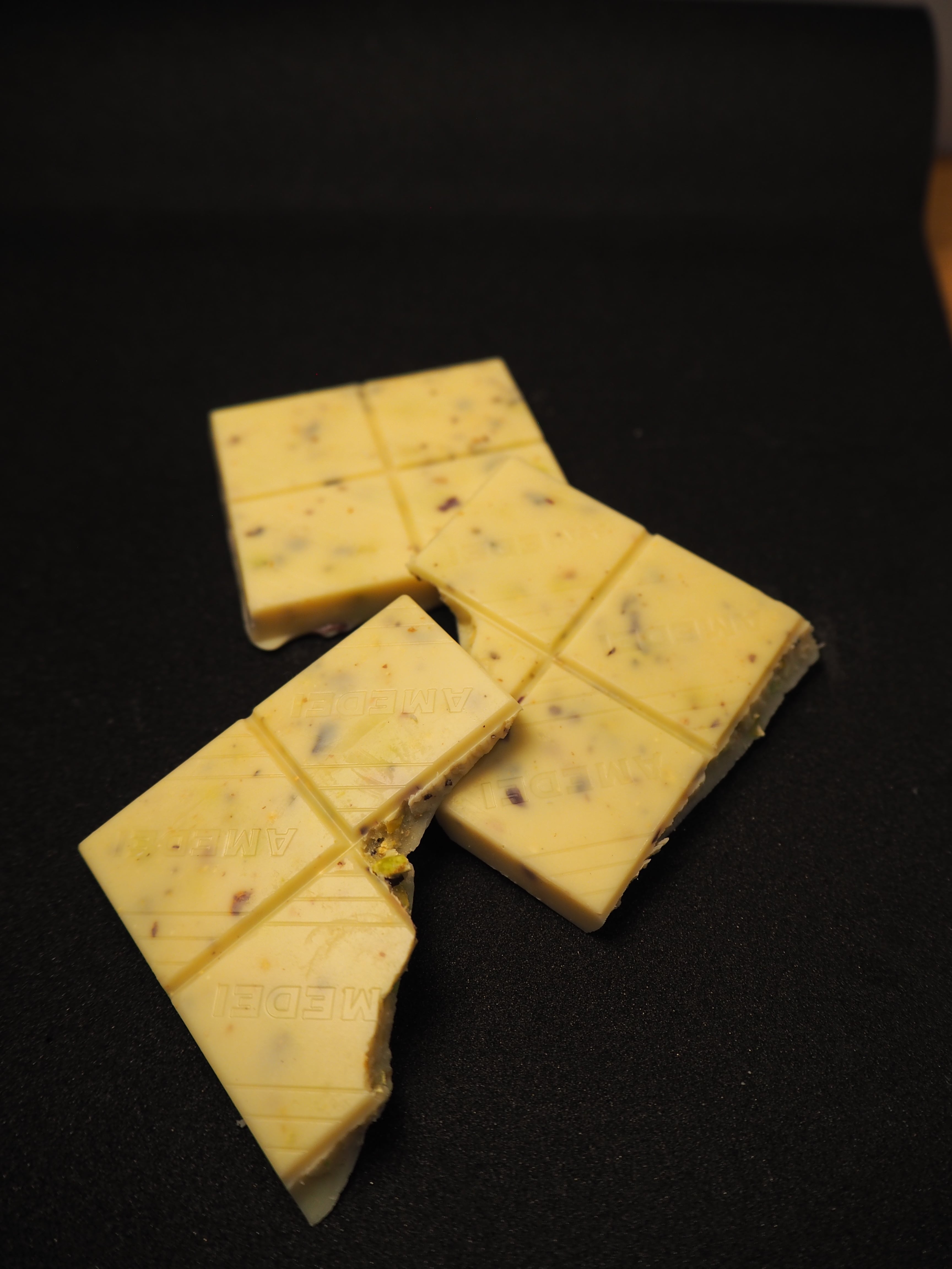 ●原材料名:キビ糖、ココアバター、全粉乳、ピスタチオ